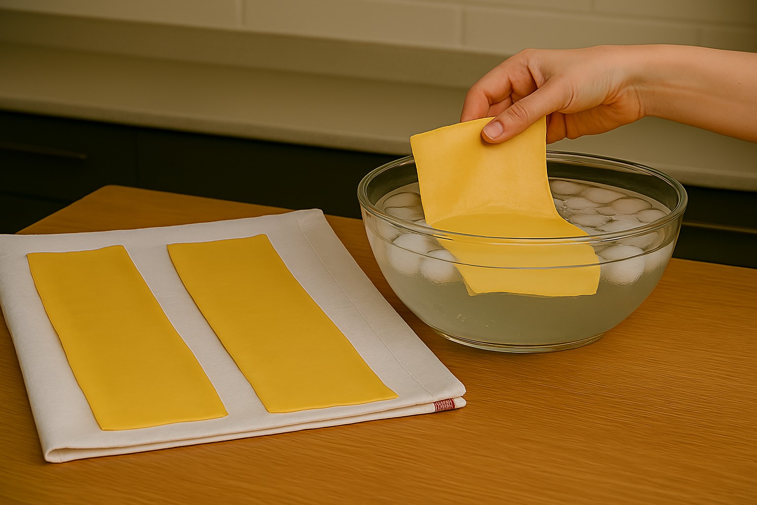 Passato il minuto mettete le sfogliette in acqua e ghiaccio per bloccare la cottura e mettetele ad asciugare in un canovaccio.