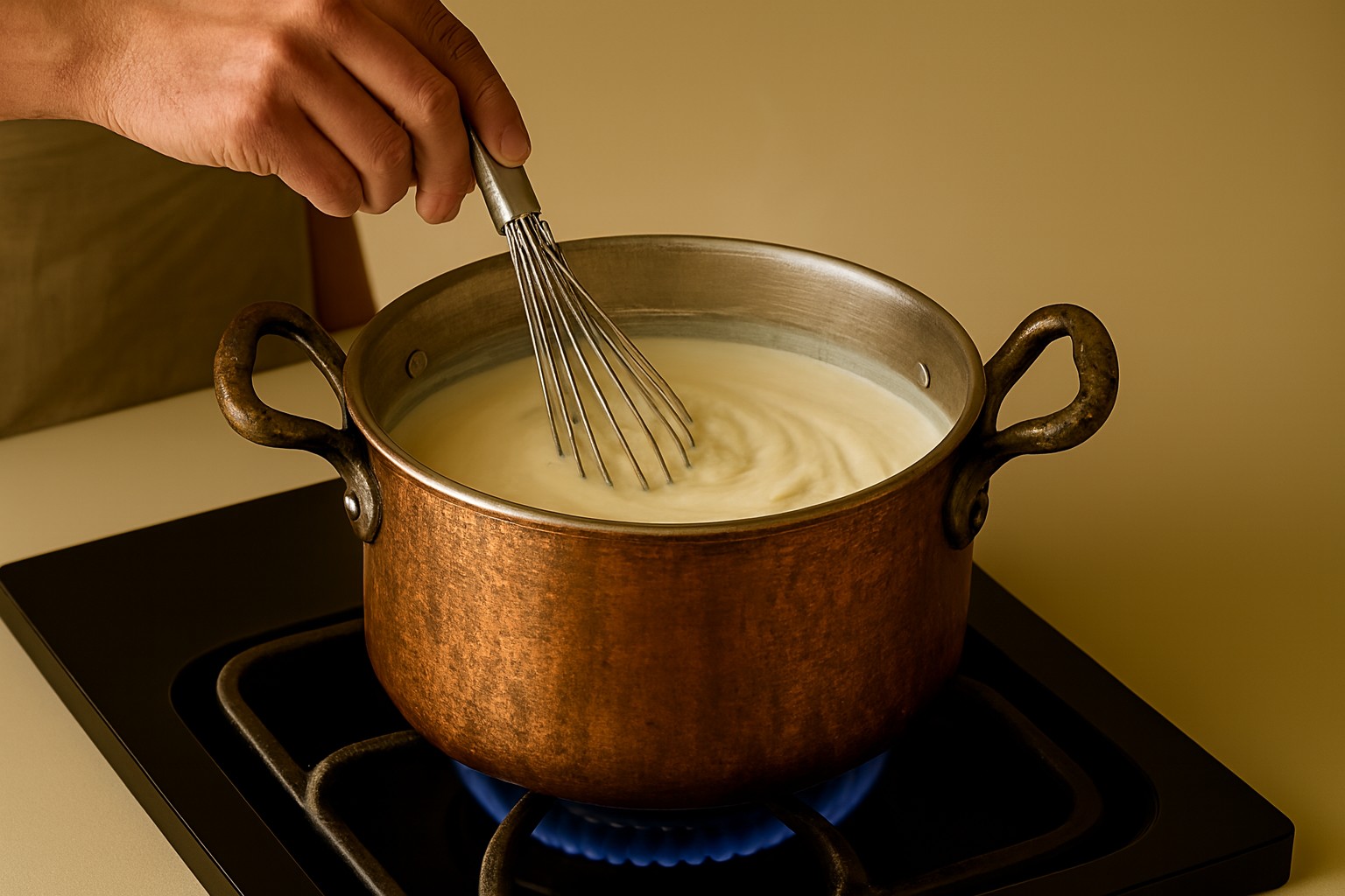 Mentre le sfoglie asciugano preparate la besciamella: in una casseruola fate sciogliere il burro, aggiungete la farina di getto e formate il Roux mescolando il burro sciolto con la farina, poi unite il latte a step, la noce moscata, un pizzico di sale, e continuate a mescolare con una frusta finché la besciamella non fissi il bollore.