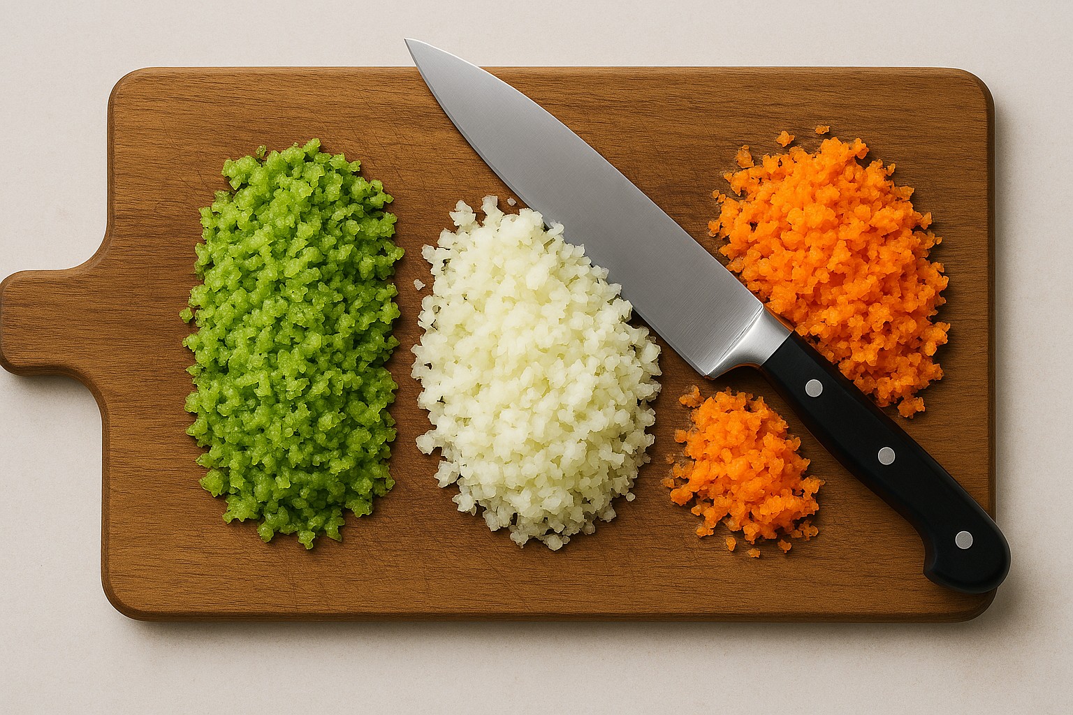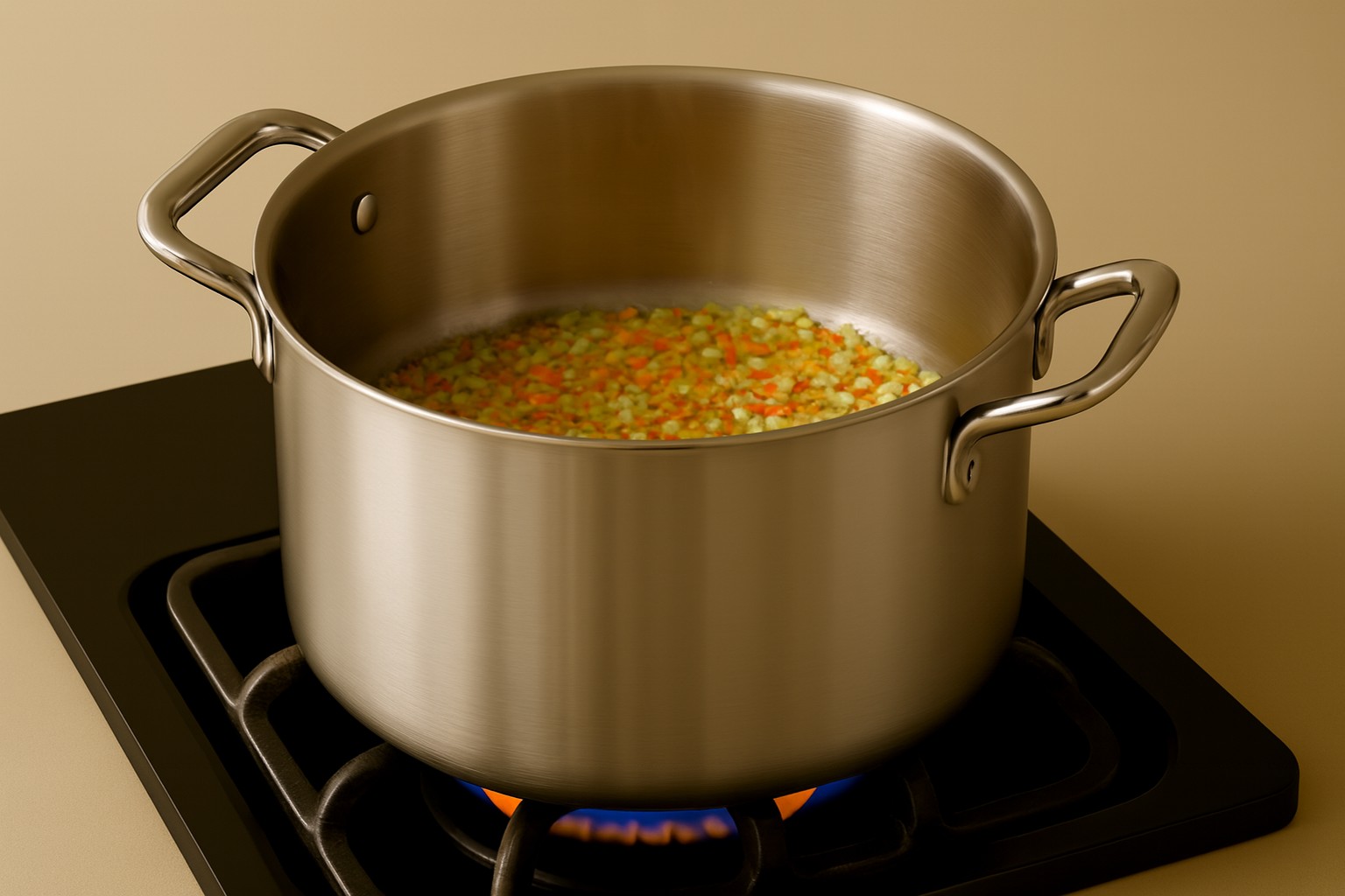 Tagliate ad haché le carote, le cipolle e le coste di sedano e fate rosolare con l’olio il soffritto.
