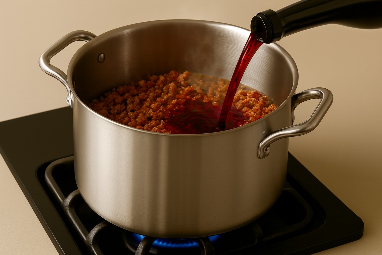 Poi aggiungete il vino e lo fate evaporare a fiamma alta.